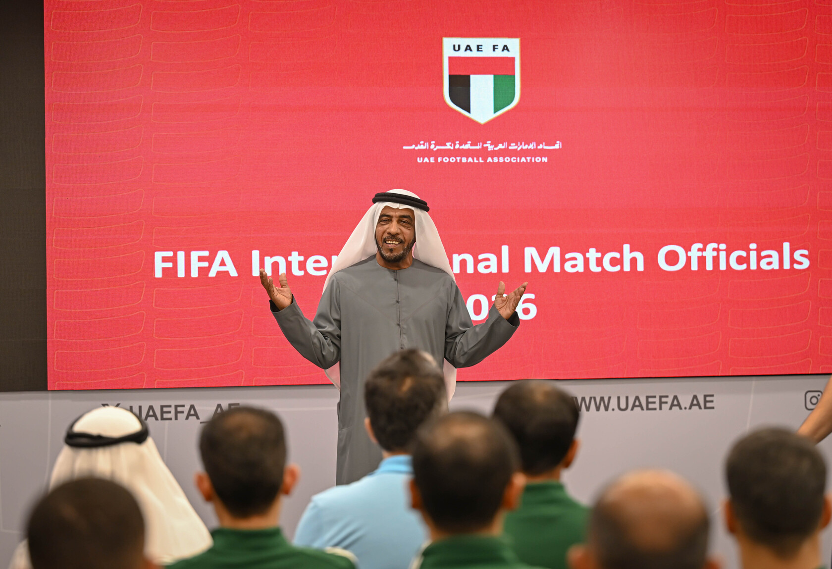 وشملت قائمة الحكام الذين تسلّموا الشارات الدولية: عمر آل علي، عادل النقبي، أحمد عيسى درويش، يحيى الملا، سلطان محمد صالح، محمد الهرمودي، وسهيل الملا (حكام الساحة) ومحمد أحمد يوسف، جاسم عبد الله، أحمد الراشدي، علي راشد النعيمي، سبت عبيد ، سعيد المرزوقي، ياسر سبيل، محمد حسين المازمي، وعامر عبد الله حسن (الحكام المساعدين) وعادل النقبي، عمر آل علي، محمد عبيد خادم، صقر الزعابي، عيسى خليفة، أحمد النقبي، وسلطان عبد الرزاق (حكام الفيديو) وفهد بدر الحوسني، أحمد الغيص، وحمد عبد الله النقبي (حكام كرة الصالات) وإبراهيم الرئيسي، ونواف أحمد (حكام الكرة الشاطئية) والحكمات خلود الزعابي، وروضة المنصوري (ساحة)، وأمل جمال (مساعد)، ونجاة البلوشي (حكمة كرة الصالات).